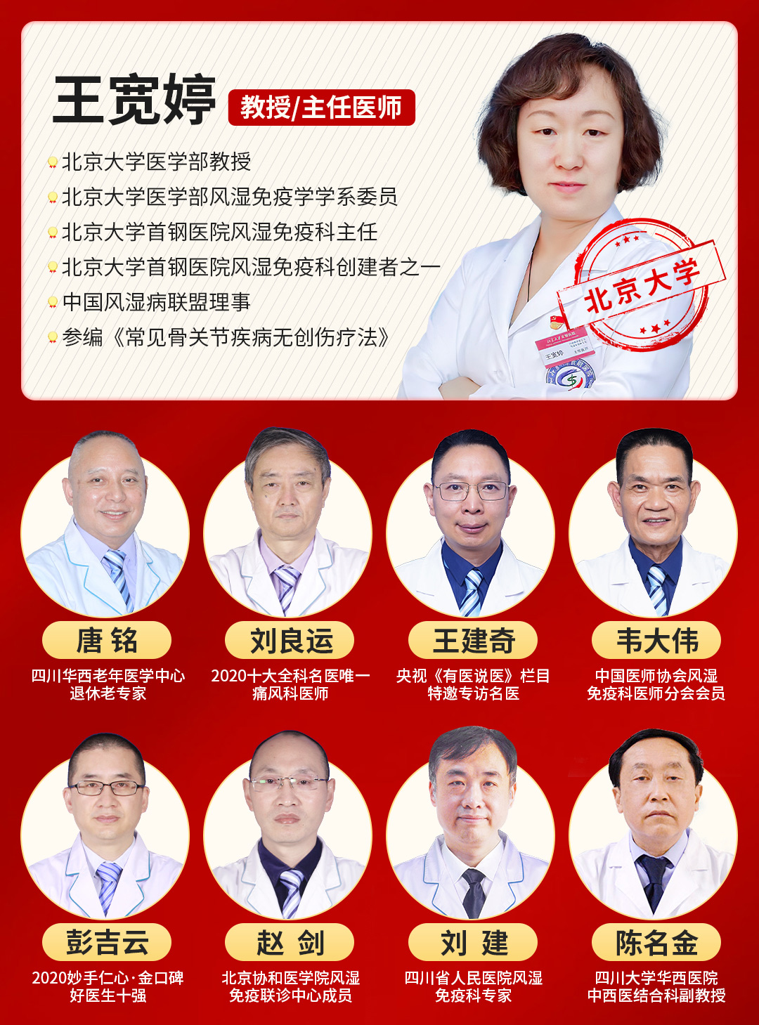 作为痛风/风湿骨病领域的领军人物,王宽婷教授自1990年起从事痛风、风湿骨病的临床诊治及实验室工作30余年,曾于北京301医院风湿免疫专业学习进修,师从国内著名风湿病学家施桂英、黄烽教授等,学习了先进的现代风湿病诊疗理念及技术。1993年协助创建北京大学首钢医院风湿免疫科,并担任风湿免疫科主任。